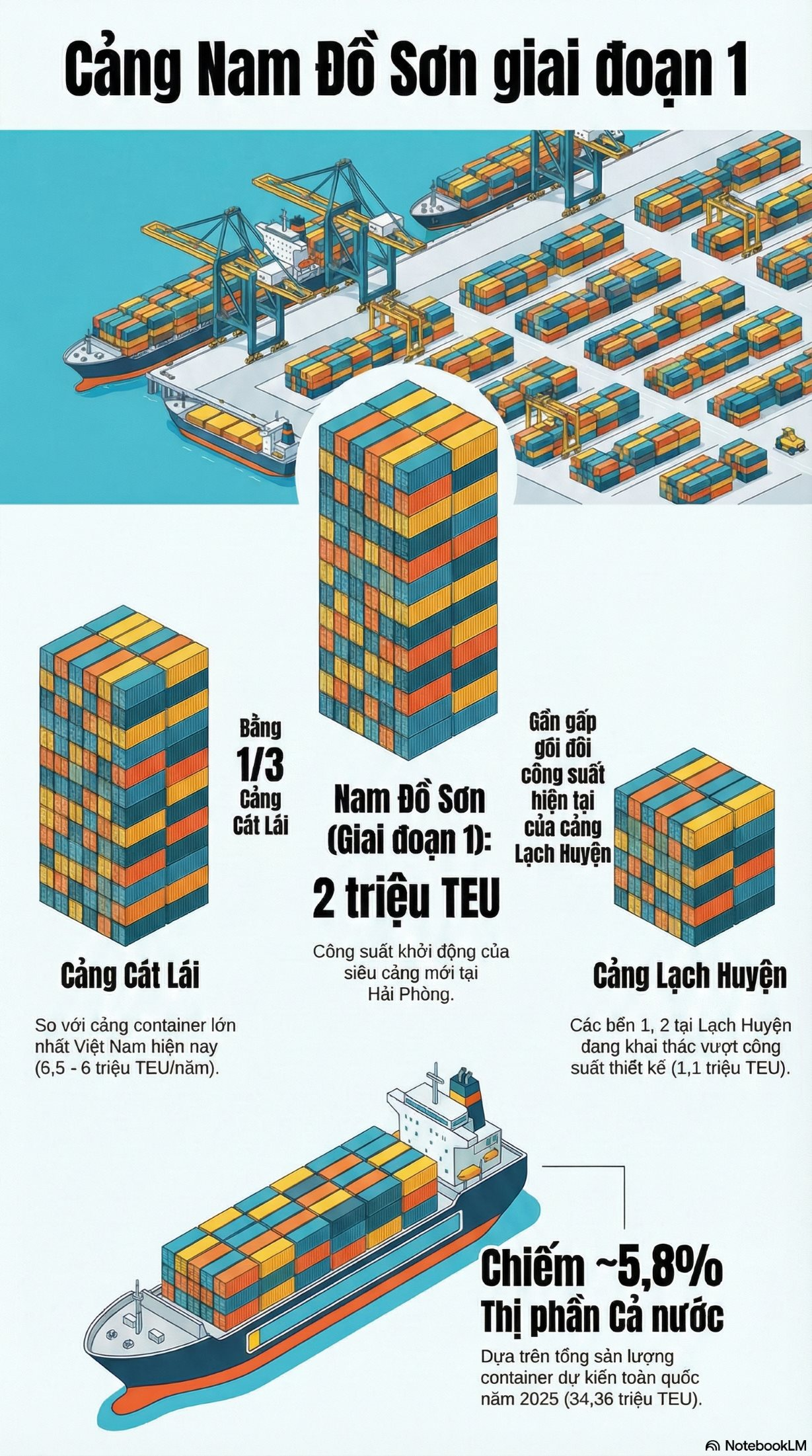 So với tổng thị trường, tổng lượng hàng container thông qua hệ thống cảng biển cả nước năm 2025 ước đạt 34,36 triệu TEU . Như vậy, công suất khởi động 2 triệu TEU của Nam Đồ Sơn tương đương khoảng 5,8% tổng "miếng bánh" thị trường cả nước.