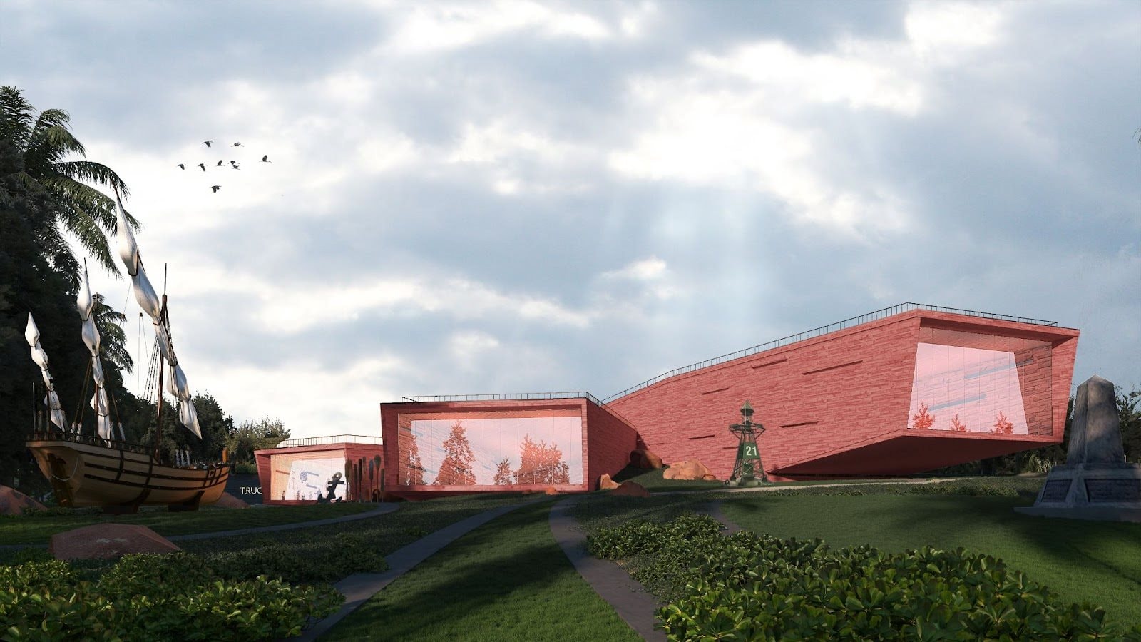 Các chi tiết kiến trúc được lồng ghép như những câu chuyện lịch sử, tôn vinh tinh thần dân tộc. Khối trung tâm mang hình khối mềm mại, uốn lượn, lấy cảm hứng từ địa hình tự nhiên và sự liên kết không gian. Công trình chính đặt tại trung tâm khu đất, vừa là điểm nhấn, vừa là hạt nhân tổ chức tổng thể.