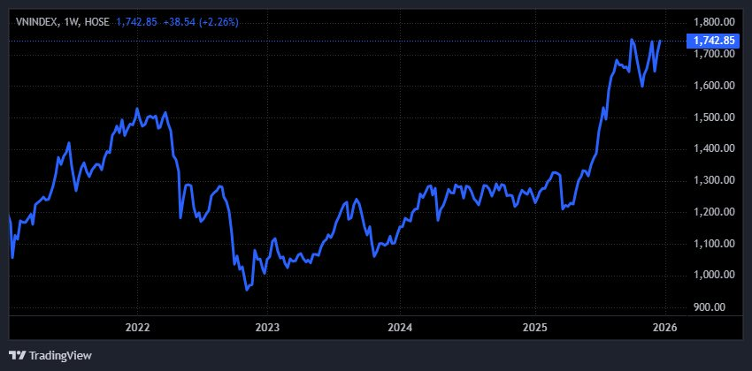 Thị trường chứng khoán Việt Nam đã trải qua một cú “quay xe” đầy bất ngờ trong những phút cuối phiên giao dịch ngày 25/12. Trước thời điểm đóng cửa, bức tranh chung vẫn khá tích cực khi VN-Index phần lớn thời gian duy trì trên mốc tham chiếu, dòng tiền dù thận trọng nhưng chưa hề rút lui, đủ sức giữ chỉ số tăng quanh 5–10 điểm. Thậm chí, có lúc VN-Index còn chạm ngưỡng 1.800 điểm – cột mốc lịch sử lần đầu tiên được ghi nhận.