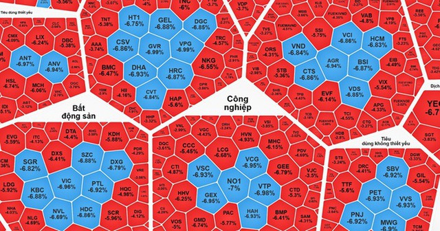Nhìn vào bảng điện tử, hàng loạt nhóm ngành xương sống đều đổ gục. Các rổ chỉ số ngành như năng lượng (-5,09%), bất động sản (-4,8%), viễn thông (-4,70%) và vật liệu cơ bản (-4,24%) ghi nhận mức giảm khốc liệt nhất.