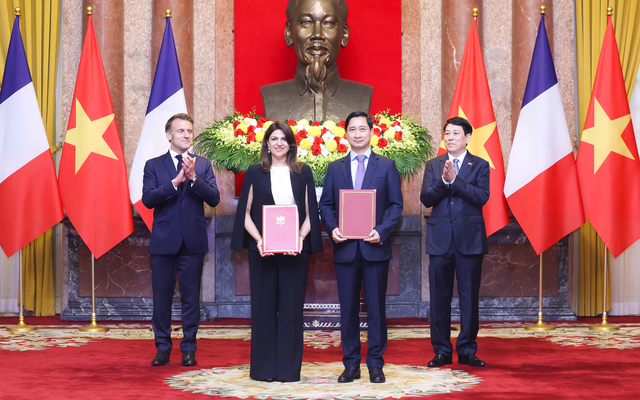 Ông Ngô Chí Dũng, Tổng Giám đốc kiêm Chủ tịch HĐQT Công ty Vắc xin Việt Nam (VNVC) và bà Zainab Sadat Qayyum, Phó Chủ tịch Sanofi vùng Đông Nam Á - Ấn Độ trao văn kiện thỏa thuận hợp tác chuyển giao công nghệ sản xuất vắc xin của Sanofi tại Nhà máy Vắc xin và Sinh phẩm VNVC trước sự chứng kiến của Chủ tịch nước Lương Cường và Tổng thống Pháp Emmanuel Macron. Ảnh: Hải Nam