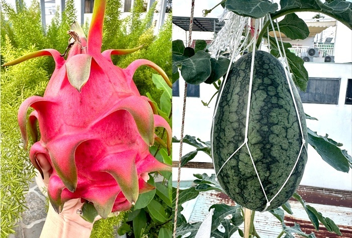 Bên cạnh rau xanh, các loại cây ăn trái như dưa lưới, dưa hấu, thanh long cũng đem lại kết quả bất ngờ về chất lượng. Nhiều bạn bè khi đến thăm và thưởng thức đều đánh giá độ ngon ngọt của trái cây nhà trồng không hề kém cạnh so với hàng ngoài thị trường. Để đạt được điều đó, chị Uyên áp dụng công thức bón phân riêng biệt cho từng giai đoạn phát triển của cây.