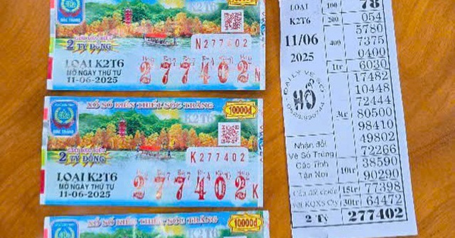 Các tờ vé số trúng giải độc đắc trên là của Công ty TNHH Một thành viên Xổ số kiến thiết Sóc Trăng với dãy số 277402, xổ ngày 11-6.
