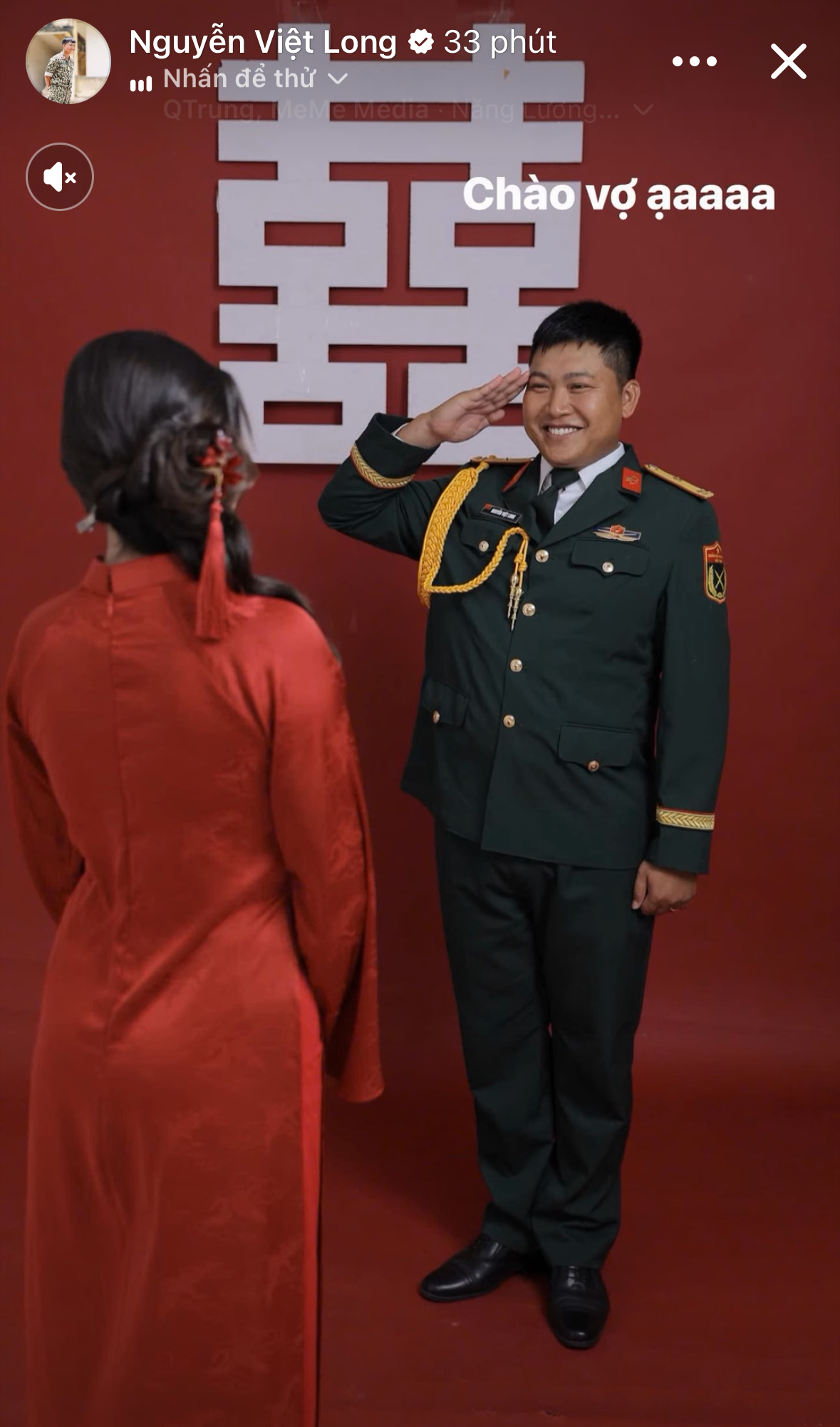 Sáng sớm ngày 18/4, Nguyễn Việt Long công khai hình ảnh cưới nét căng bên nửa kia. Trong khoảnh khắc được chia sẻ, nam quân nhân mặc quân phục, rạng rỡ đứng cạnh cô dâu xinh đẹp. Đi kèm hình ảnh, anh viết đúng một chữ: “Khoái” để diễn tả cảm giác khi sắp lấy vợ.
