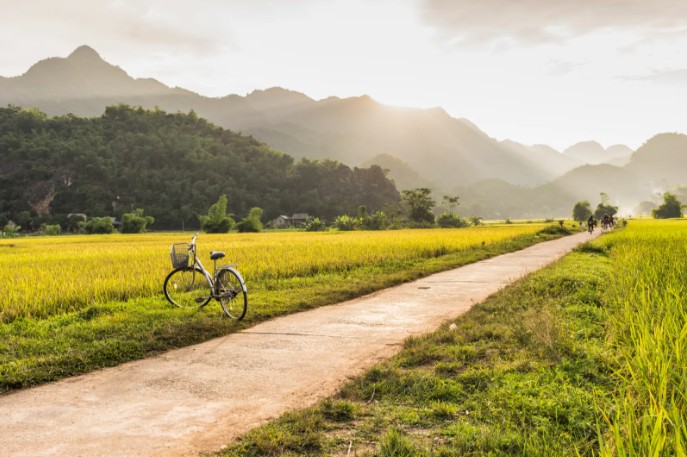 Đạp xe xuyên qua những cánh đồng lúa xanh mướt là một trải nghiệm mang tính biểu tượng của Việt Nam. Những cung đường này trải dài khắp đất nước – từ đồng bằng sông Hồng màu mỡ ở phía Bắc đến vùng quê yên bình quanh Hội An.