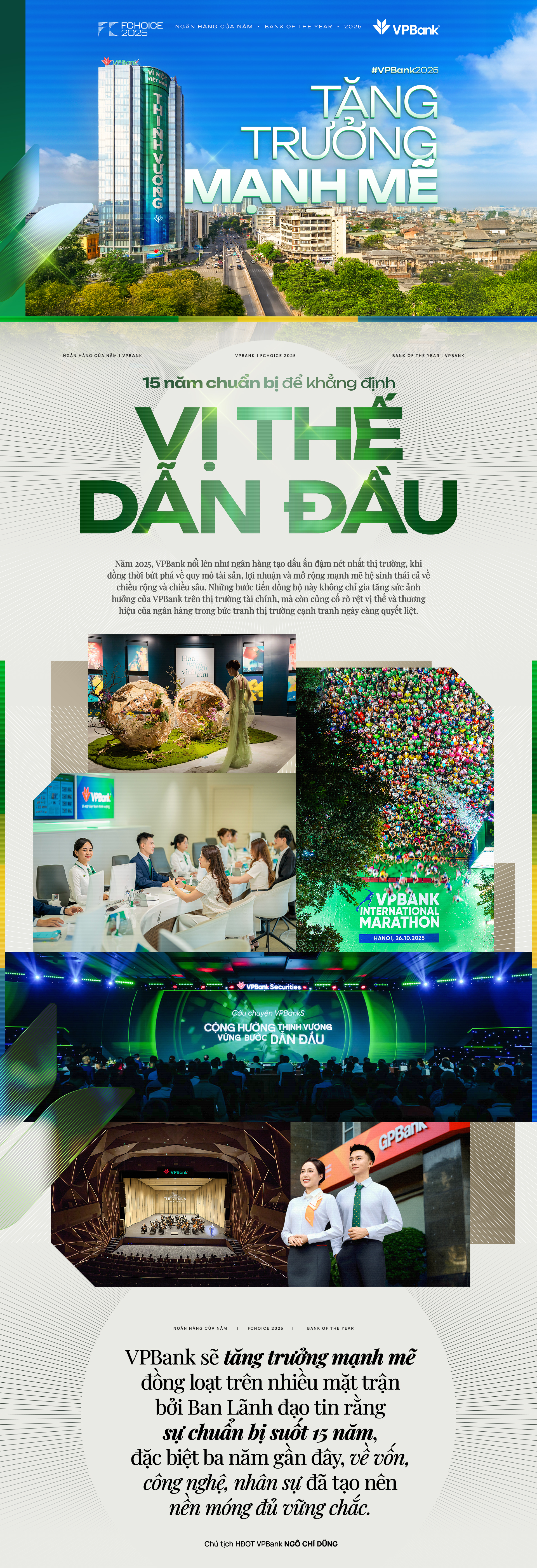 "VPBank sẽ tăng trưởng mạnh mẽ đồng loạt trên nhiều mặt trận bởi Ban lãnh đạo tin rằng sự chuẩn bị suốt 15 năm, đặc biệt ba năm gần đây, về vốn, công nghệ, nhân sự đã tạo nên nền móng đủ vững chắc", lời khẳng định của Chủ tịch Hội đồng quản trị VPBank Ngô Chí Dũng không chỉ củng cố nền tảng cho cam kết tăng trưởng lợi nhuận 35–40% trong 5 năm tới, mà còn là chìa khóa lý giải cho những gì đang diễn ra tại VPBank trong năm 2025 – một năm mà ngân hàng đã vươn mình mạnh mẽ.