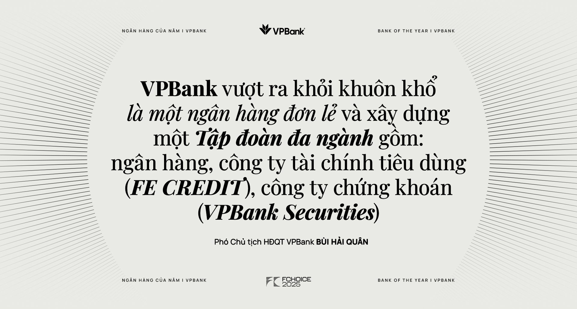 Suốt 32 năm phát triển, VPBank đã nhiều lần trải qua những bước ngoặt chiến lược, nhưng hiếm có giai đoạn nào ghi dấu sự bứt phá như năm 2025, khi ngân hàng vươn mình mạnh mẽ thể hiện rõ hình ảnh của một tập đoàn tài chính tư nhân hàng đầu. VPBank hiện là ngân hàng có phạm vi hoạt động rộng nhất, đa phân khúc, đa nền tảng. Ngân hàng dẫn đầu trong tín dụng tiêu dùng, tài trợ bất động sản, cho vay mua nhà, ôtô, thẻ tín dụng,…