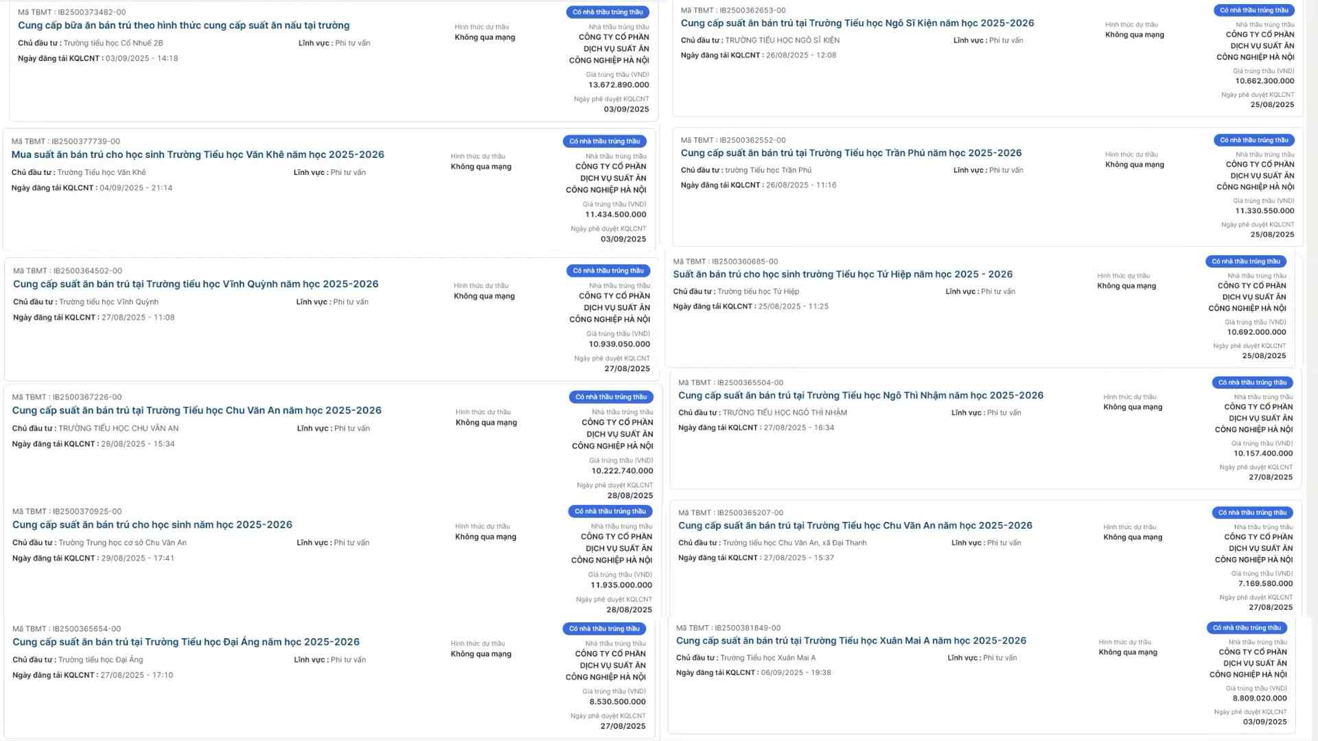 Bên cạnh những gói thầu trên, năm học 2025-2026, Công ty cổ phần Dịch vụ Suất ăn công nghiệp Hà Nội còn trúng cả chục gói thầu trên dưới 1 tỷ đồng tại các trường phổ thông công lập trên địa bàn Thủ đô.