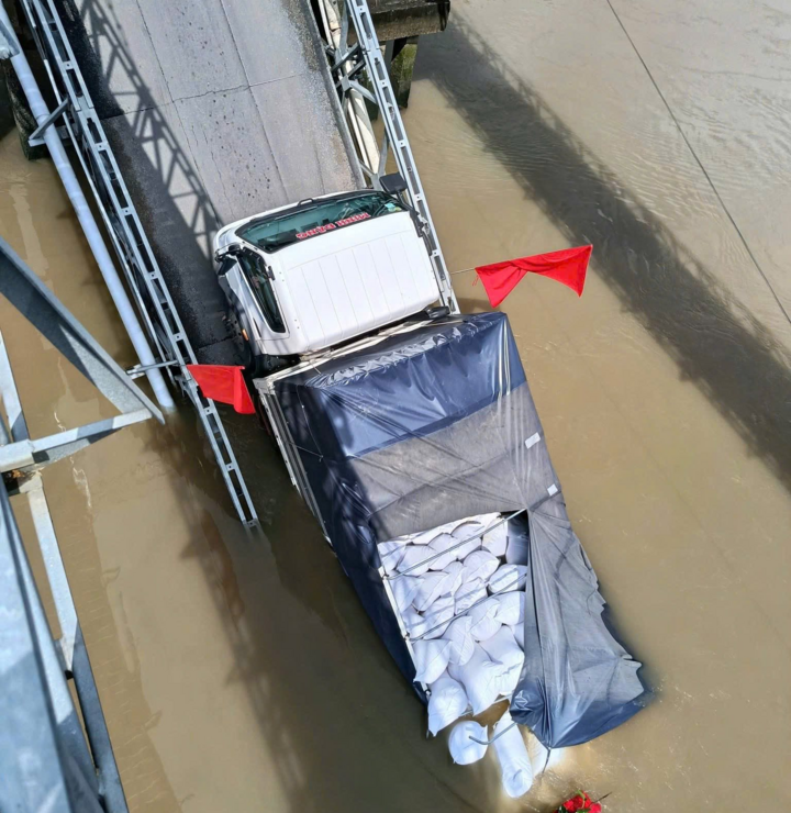 Tại hiện trường, nửa thân xe tải chìm dưới kênh, nhiều bao gạo đổ ra ngoài, tài xế mở cửa xe chạy ra kêu cứu.