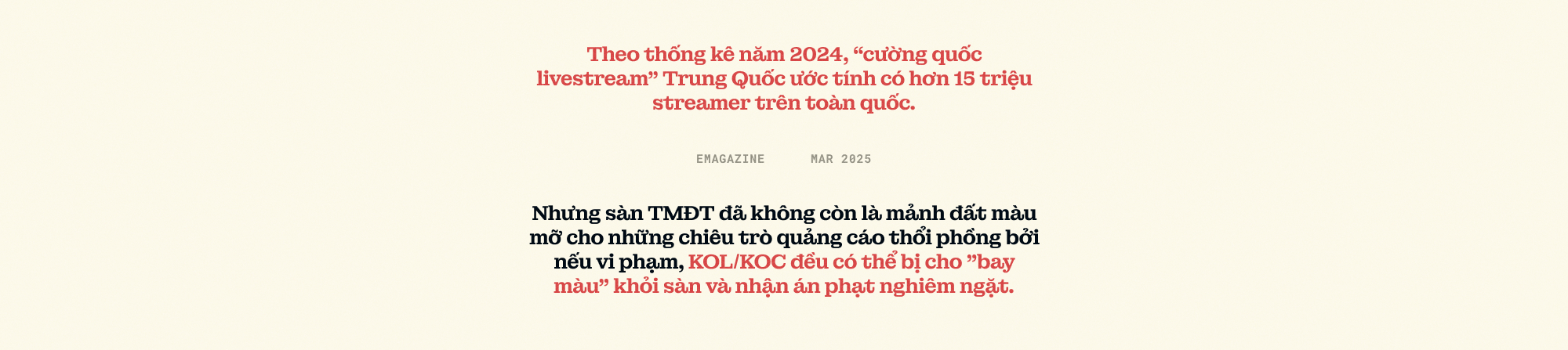 Theo thống kê năm 2024, "cường quốc livestream" Trung Quốc ước tính có hơn 15 triệu streamer trên toàn quốc. Nhưng sàn TMĐT đã không còn là mảnh đất màu mỡ cho những chiêu trò quảng cáo thổi phồng bởi nếu vi phạm, KOL/KOC đều có thể bị cho "bay màu" khỏi sàn và nhận án phạt nghiêm ngặt.