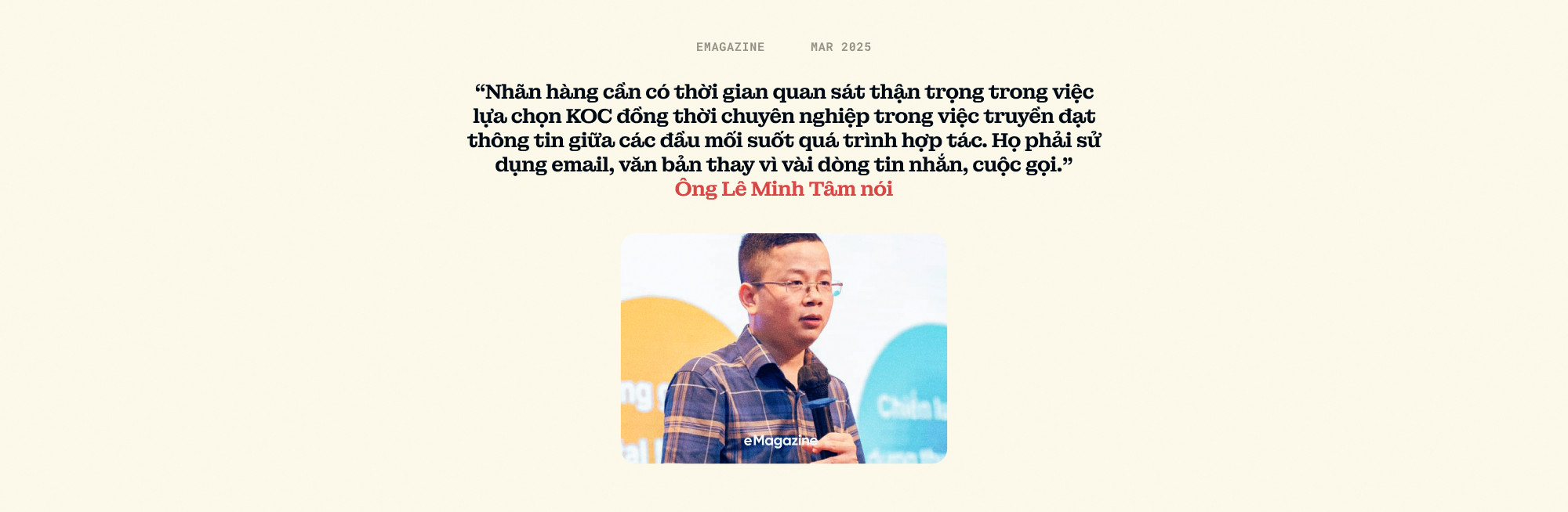 "Nhãn hàng cần có thời gian quan sát thận trọng trong việc lựa chọn KOC đồng thời chuyên nghiệp trong việc truyền đạt thông tin giữa các đầu mối suốt quá trình hợp tác. Họ phải sử dụng email, văn bản thay vì vài dòng tin nhắn, cuộc gọi.