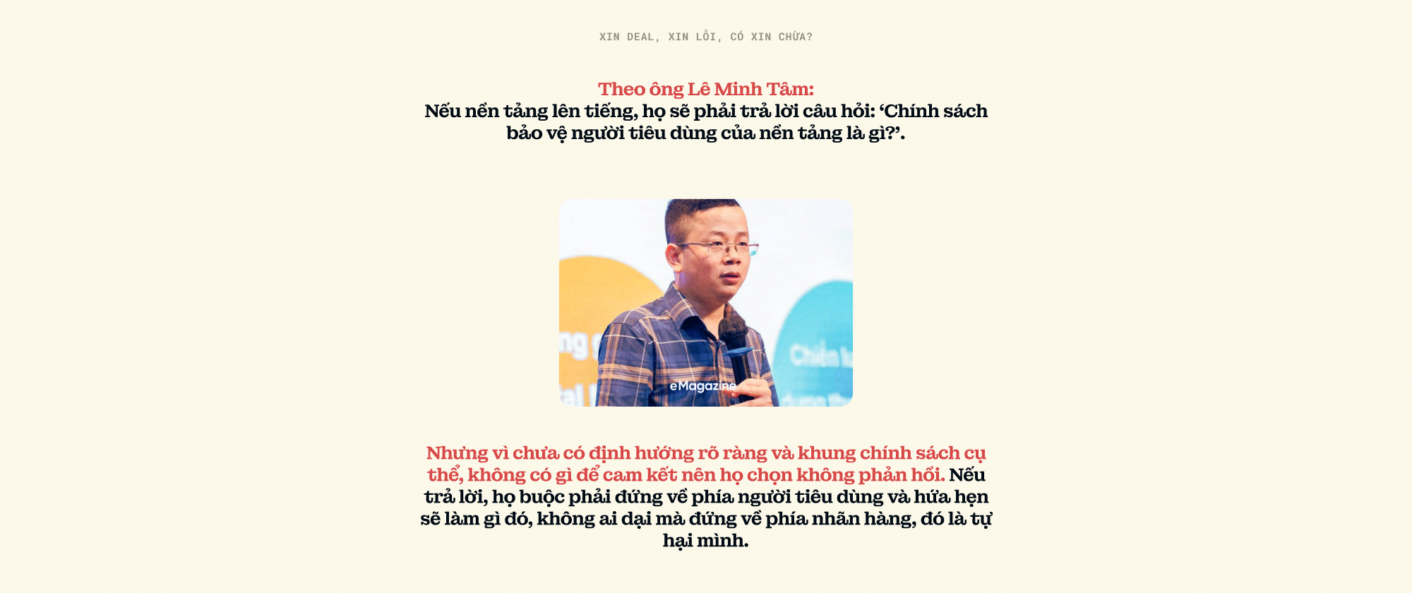 Theo ông Lê Minh Tâm, nền tảng im lặng trước drama của KOC vì chưa xây dựng được chính sách minh bạch, rõ ràng để bảo vệ người tiêu dùng: "Nếu nền tảng lên tiếng, họ sẽ phải trả lời câu hỏi: 'Chính sách bảo vệ người tiêu dùng của nền tảng là gì?'. Nhưng vì chưa có định hướng rõ ràng và khung chính sách cụ thể, không có gì để cam kết nên họ chọn không phản hồi. Nếu trả lời, họ buộc phải đứng về phía người tiêu dùng và hứa hẹn sẽ làm gì đó, không ai dại mà đứng về phía nhãn hàng, đó là tự hại mình".
