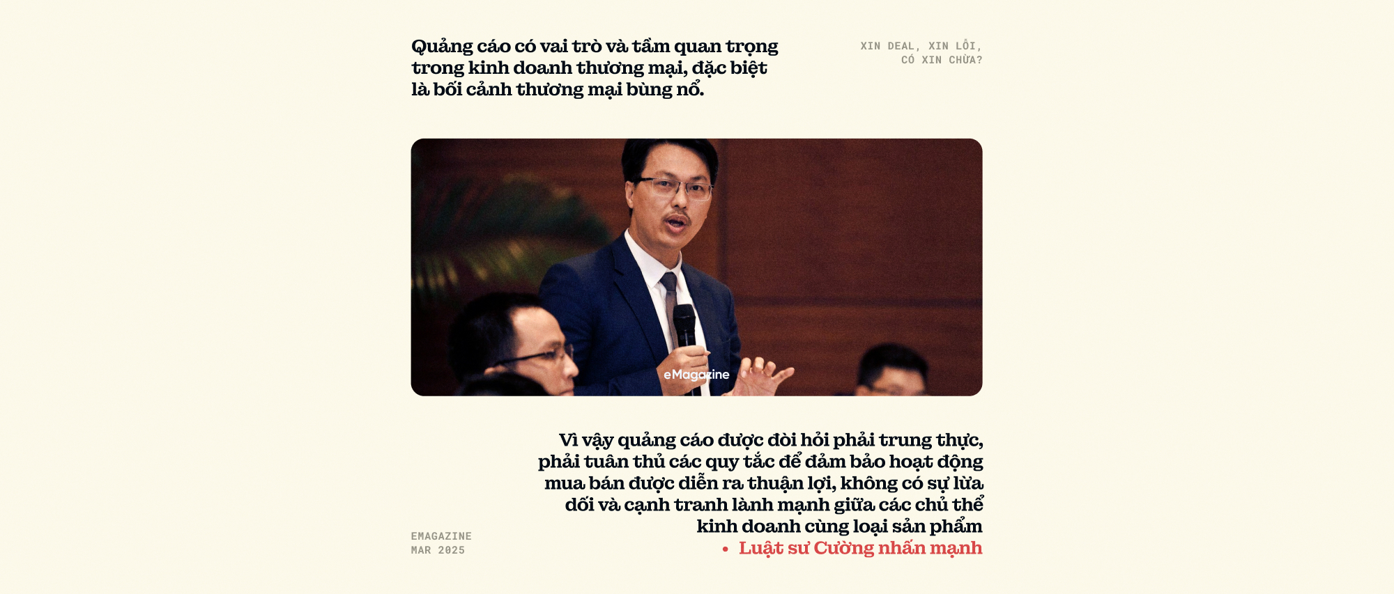 "Quảng cáo có vai trò và tầm quan trọng trong kinh doanh thương mại, đặc biệt là bối cảnh thương mại bùng nổ. Vì vậy quảng cáo được đòi hỏi phải trung thực, phải tuân thủ các quy tắc để đảm bảo hoạt động mua bán được diễn ra thuận lợi, không có sự lừa dối và cạnh tranh lành mạnh giữa các chủ thể kinh doanh cùng loại sản phẩm" - luật sư Cường nhấn mạnh.