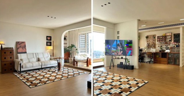 Một gia chủ khác phá tường ngăn phòng ngủ, giữ lại nửa vách làm vách ngăn bo tròn. Nhờ đó phòng khách rộng gần gấp đôi, vừa có góc làm việc vừa là nơi uống cà phê cuối tuần.
