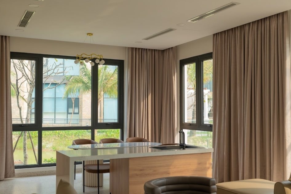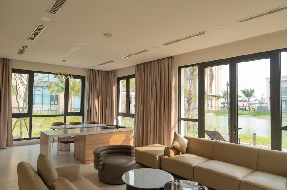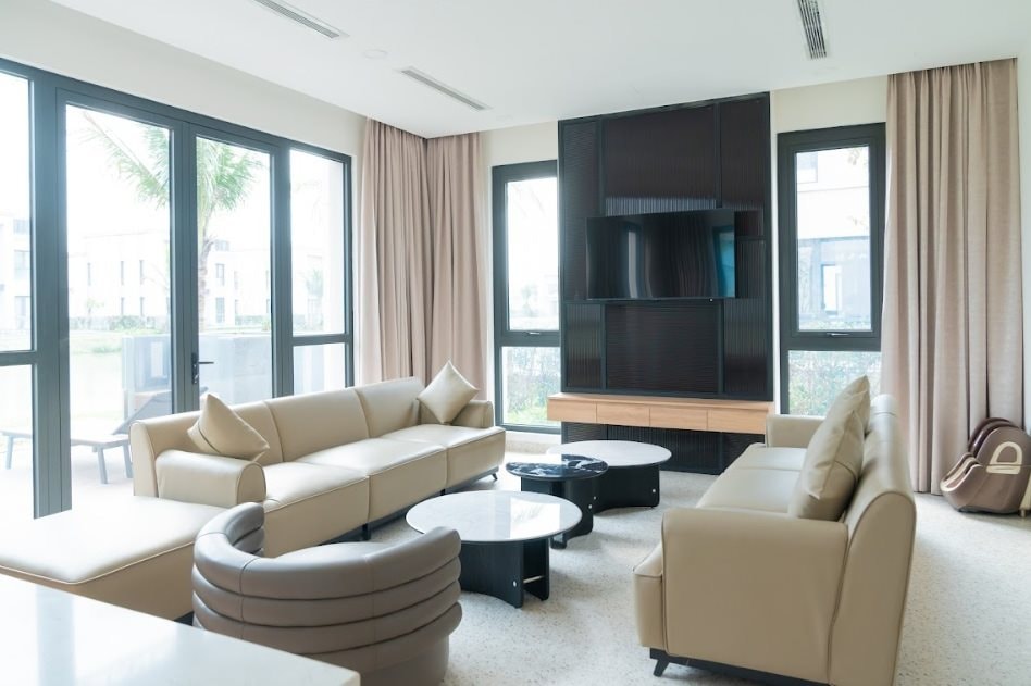 Trong mỗi căn biệt thự, không gian sống được thiết kế đầy đủ tiện nghi với phòng khách rộng rãi, khu bếp hiện đại và hệ thống giải trí cao cấp, mang đến cảm giác như một tổ ấm thực thụ. Người bệnh và gia đình không chỉ được chăm sóc y tế an toàn, mà còn tận hưởng không gian sống sang trọng, riêng tư, hòa mình với thiên nhiên trong suốt hành trình hồi phục.