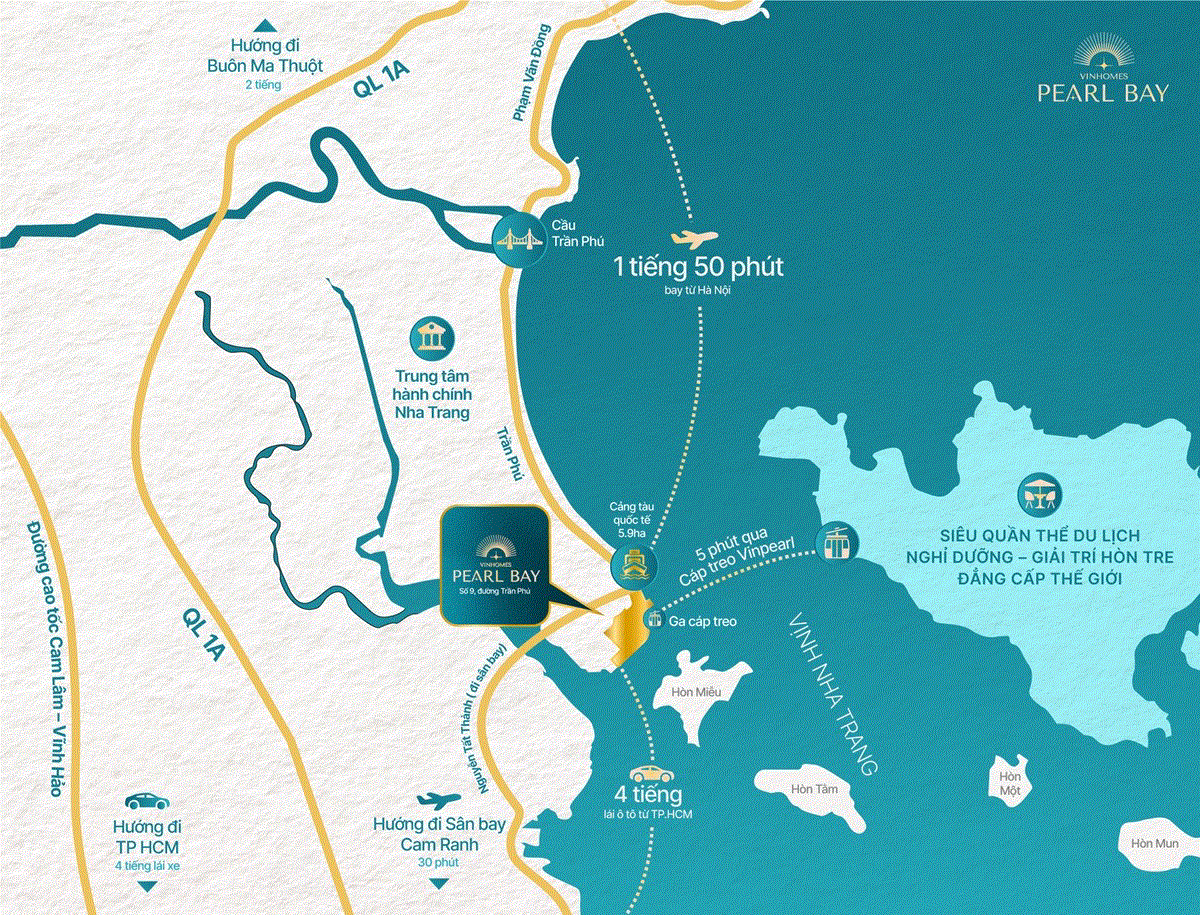Từ Vinhomes Pearl Bay, cư dân cũng chỉ mất khoảng 30 phút để đến sân bay quốc tế Cam Ranh, nơi đang khai thác hàng chục đường bay thẳng đến Seoul, Bangkok, Singapore và nhiều thành phố lớn ở Trung Quốc, bên cạnh các chặng nội địa trọng điểm như Hà Nội, TP.HCM, Đà Nẵng. Cư dân cũng dễ dàng kết nối với QL1A - trục đường bộ huyết mạch xuyên suốt từ Hà Nội đến Cà Mau ; cao tốc Cam Lâm - Vĩnh Hảo , mở ra trục kết nối tốc độ cao về phía Nam, rút ngắn đáng kể thời gian di chuyển đến Bình Thuận, Phan Thiết và TP.HCM .