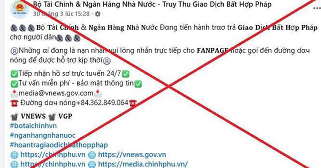 Thông tin từ Cổng thông tin điện tử Công an TP.Hà Nội, hiện nay trên mạng xã hội xuất hiện trang Facebook mạo danh Bộ Tài Chính đăng tải nhiều video, bài viết có nội dung tiếp nhận thông tin, hỗ trợ người dân bị lừa đảo trên mạng, truy thu tiền bị lừa.