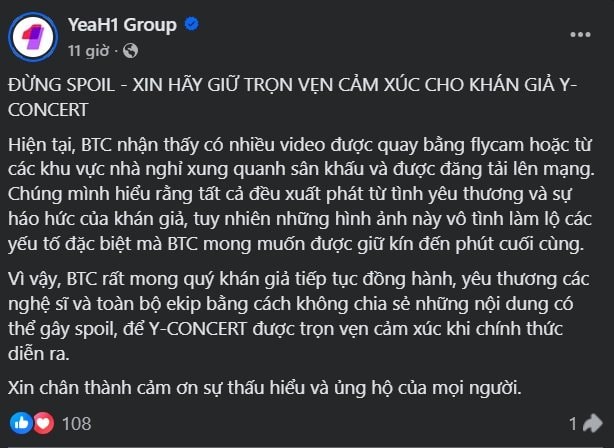 “Chúng mình hiểu rằng tất cả đều xuất phát từ tình yêu thương và sự háo hức của khán giả”, đại diện BTC chia sẻ trong bài đăng. Tuy nhiên, việc lan truyền các hình ảnh chưa được công bố có thể làm giảm trải nghiệm cảm xúc mà ê-kíp mong muốn mang lại cho người xem khi Y-CONCERT chính thức diễn ra.
